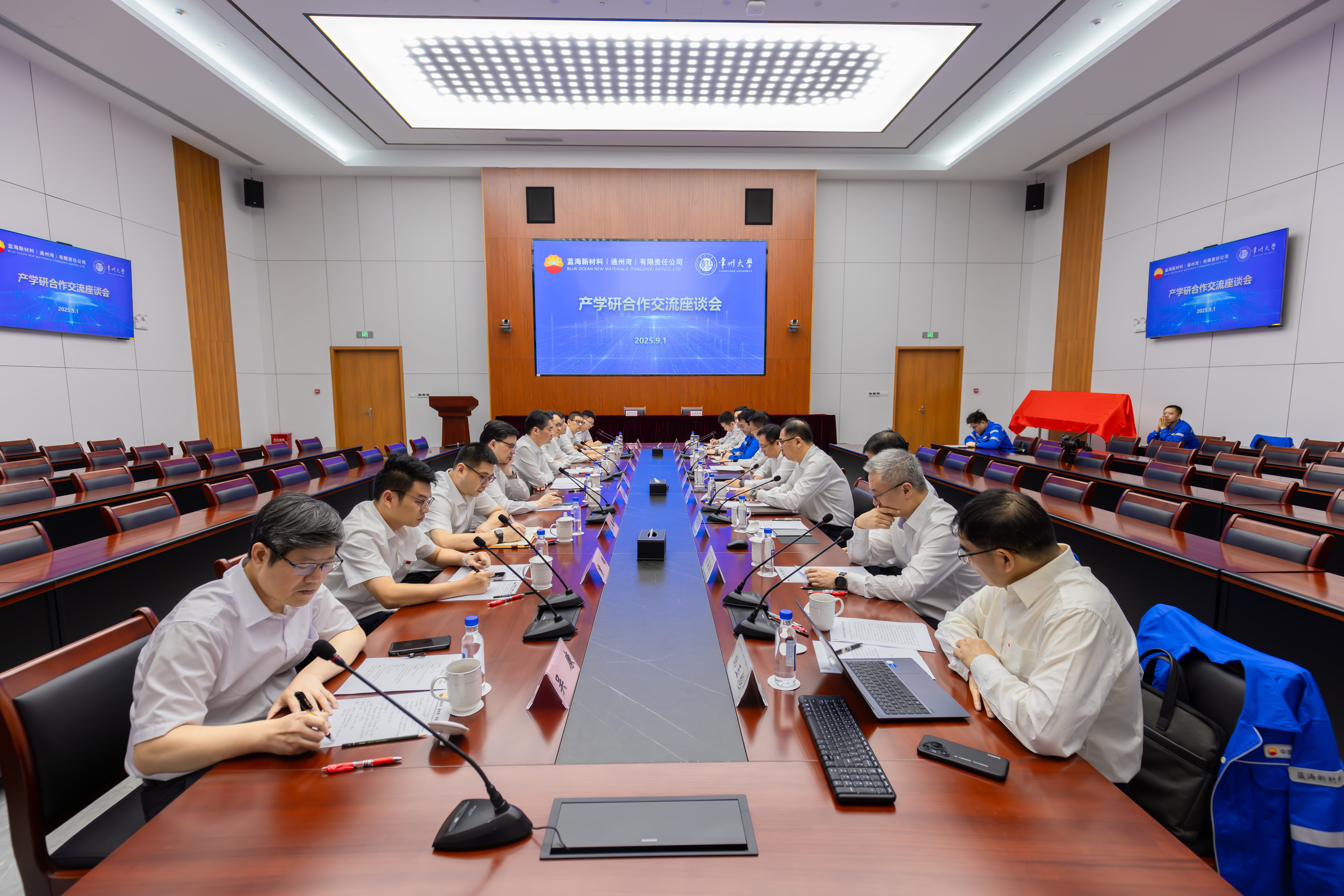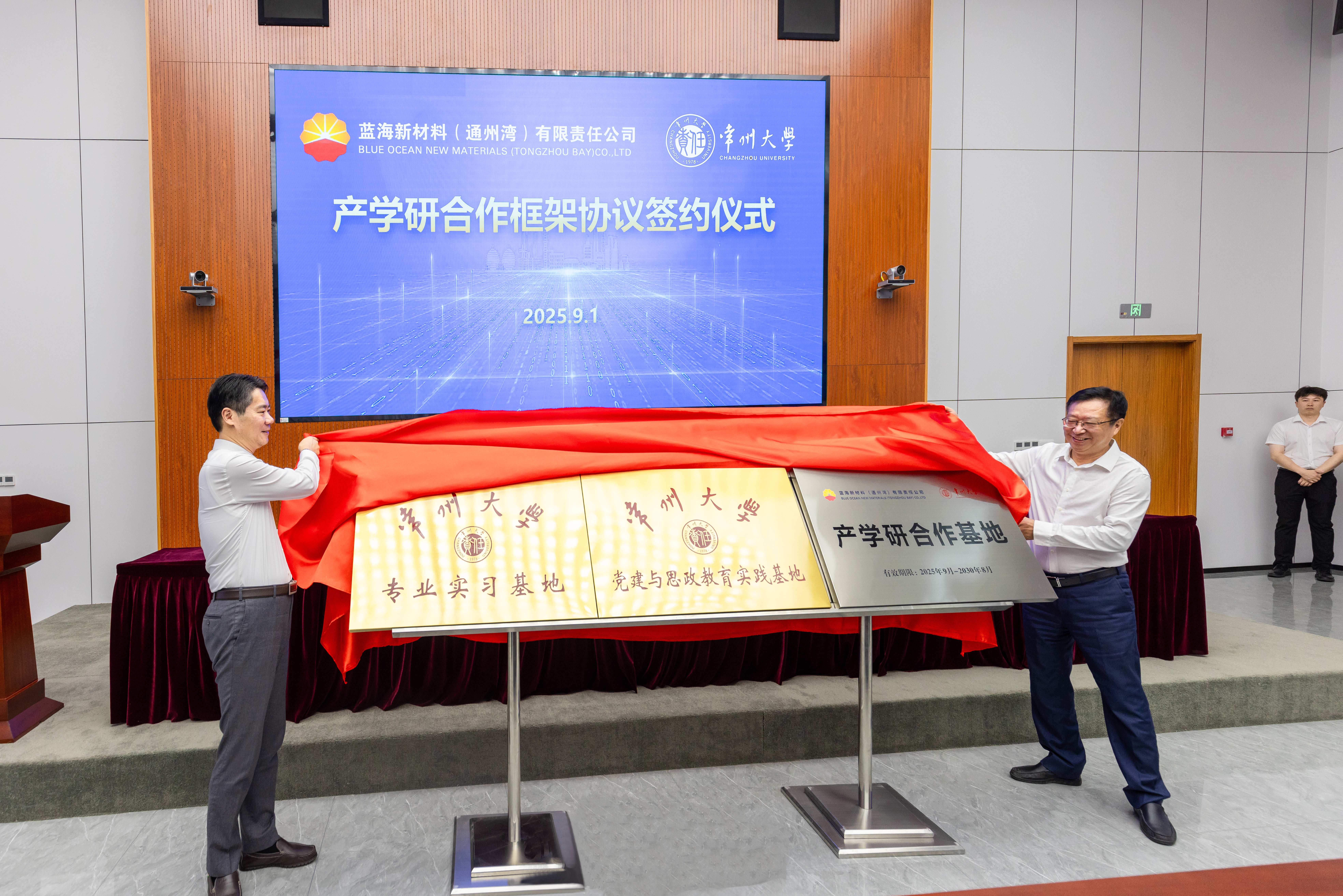 9月1日,常州大學(xué)與藍(lán)海新材料(通州灣)有限責(zé)任公司(以下簡稱“藍(lán)海新材料”)合作簽約儀式舉行。藍(lán)海新材料黨委書記、執(zhí)行董事李貴合,總經(jīng)理田春光,黨委副書記、紀(jì)委書記、工會主席陶建文,黨委委員、副總經(jīng)理勞國瑞,以及設(shè)計(jì)管理部、生產(chǎn)技術(shù)部、綜合管理部、(黨委)辦公室、黨委組織部(人力資源部)相關(guān)負(fù)責(zé)人出席,常州大學(xué)黨委副書記、校長陳海群,原黨委書記陳群,副校長晏成林及黨委組織部、學(xué)生工作部、能源化工行業(yè)創(chuàng)新處等相關(guān)部門負(fù)責(zé)人參加會議。田春光主持儀式。